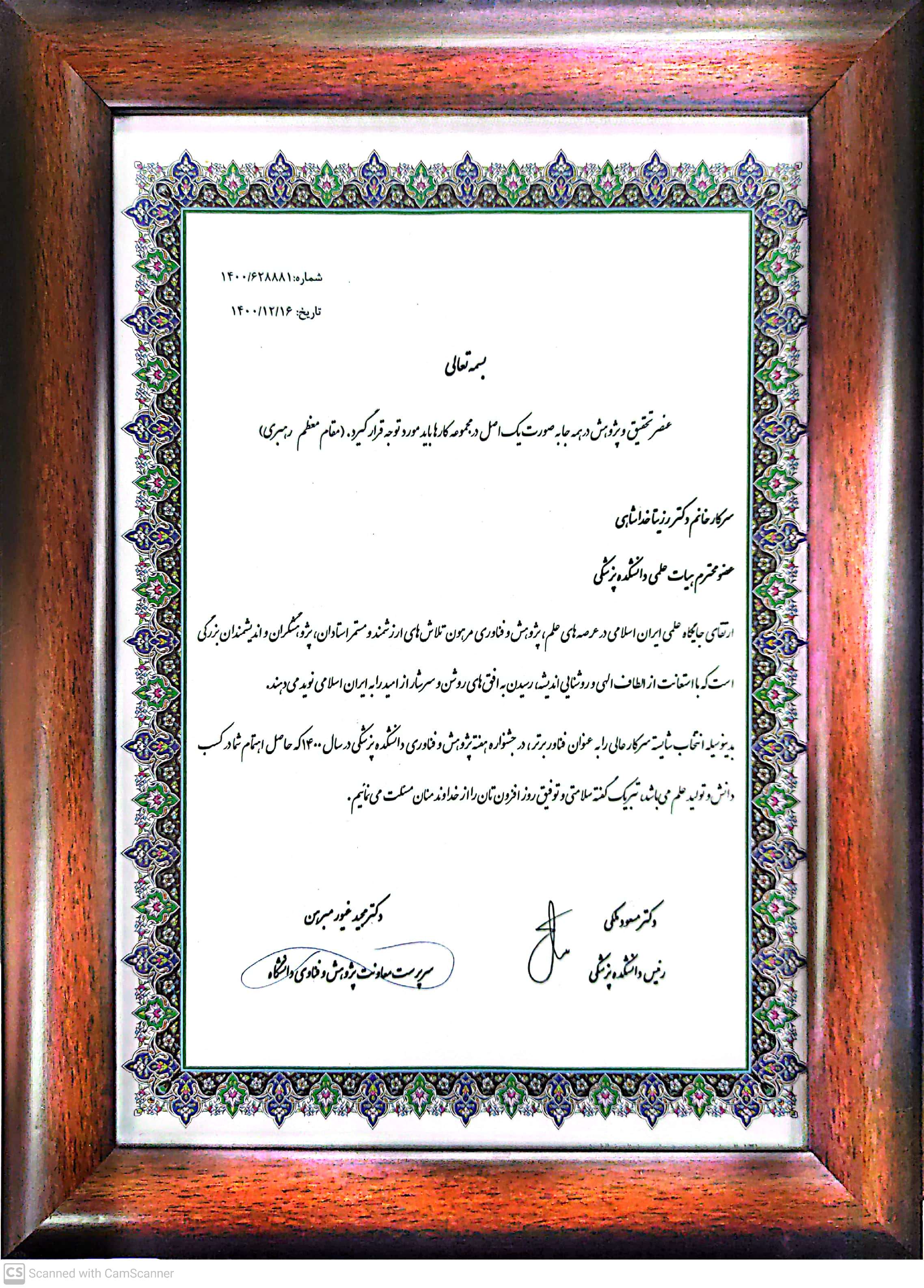 انتخاب سرکار خانم دکتر خداشاهی به عنوان پژوهشگر برتر علوم بالینی در نوزدهمین دوره هفته پژوهش و فناوری دانشگاه علوم پزشکی مشهد در سال 1400