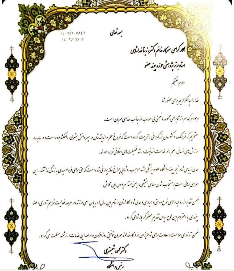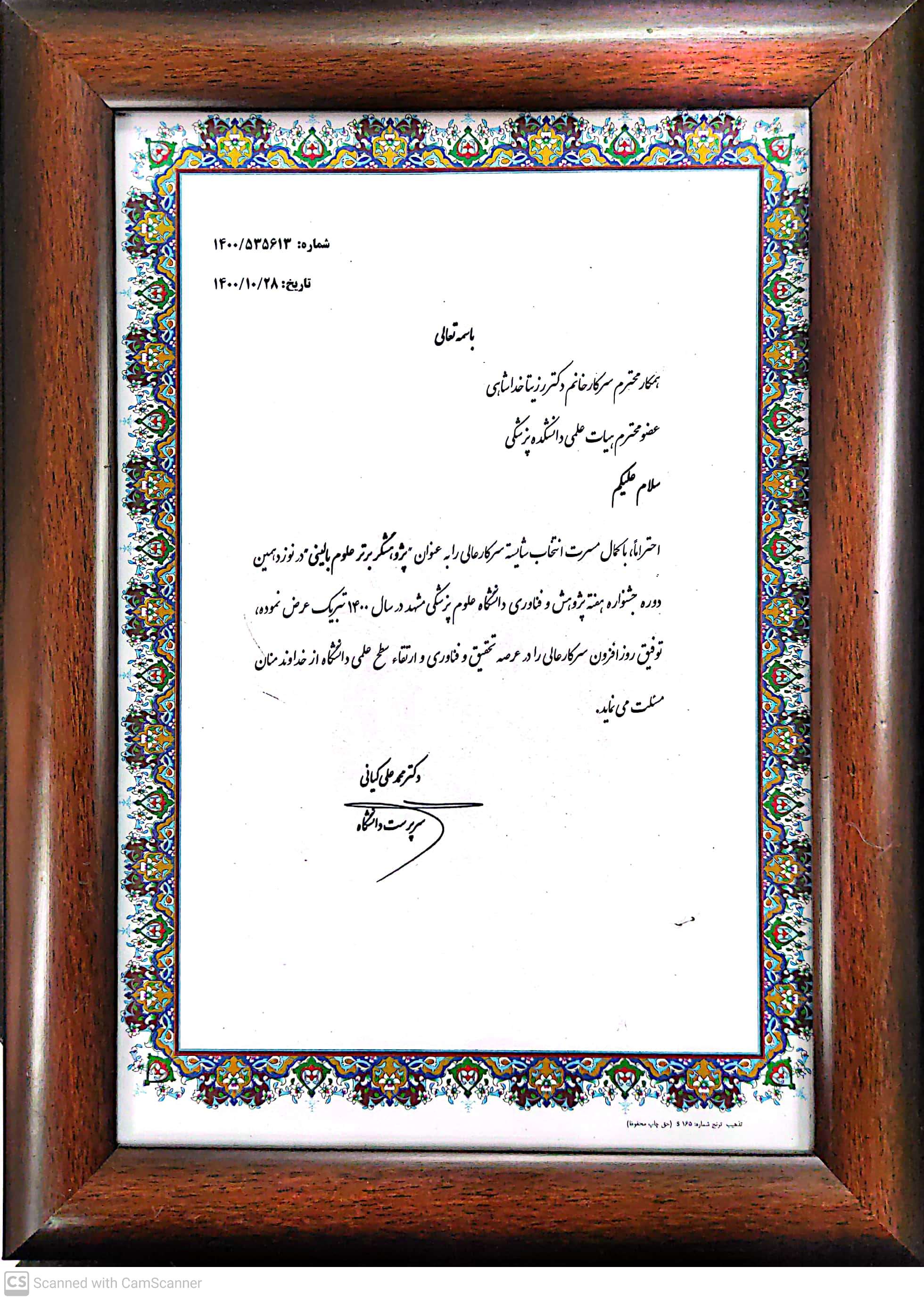 تجلیل از سرکار خانم دکتر خداشاهی در جشنواره ضیافت زندگی به عنوان استاد برتر پژوهشی