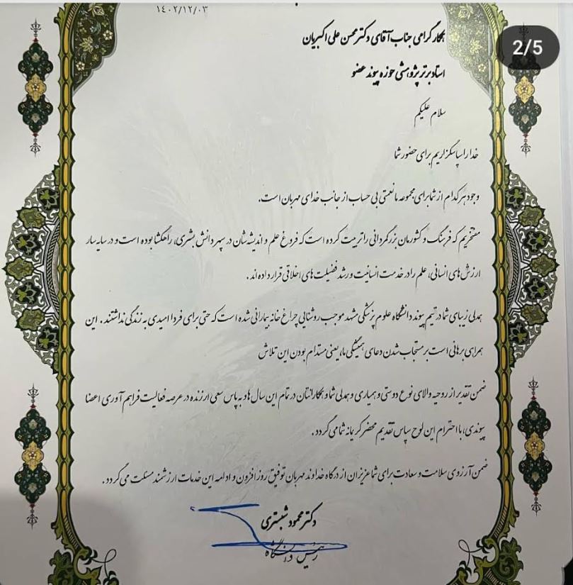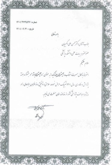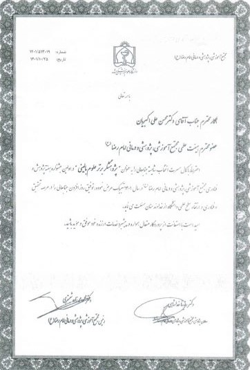 تجلیل از جناب آقای دکتر محسن علی اکبریان در جشنواره ضیافت زندگی به عنوان استاد برتر پژوهشی