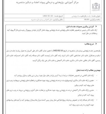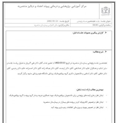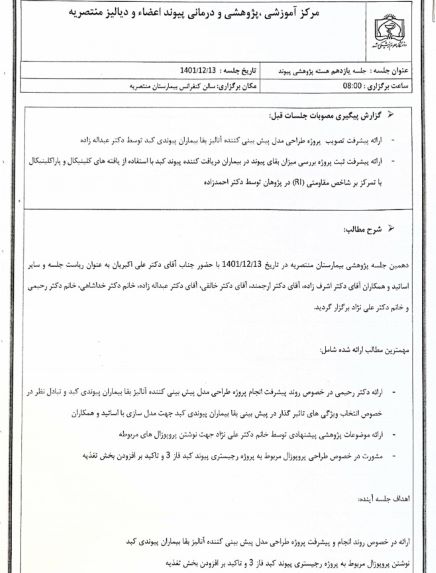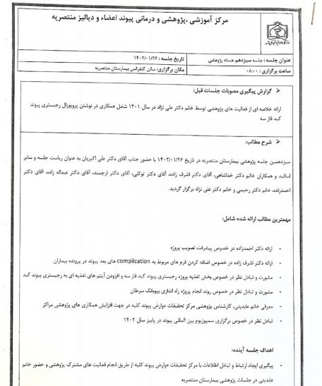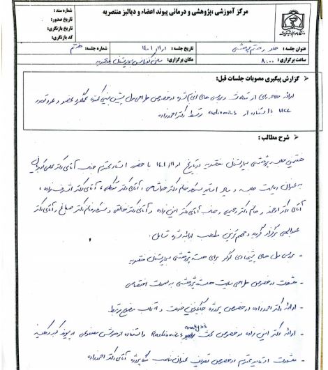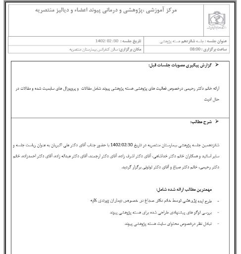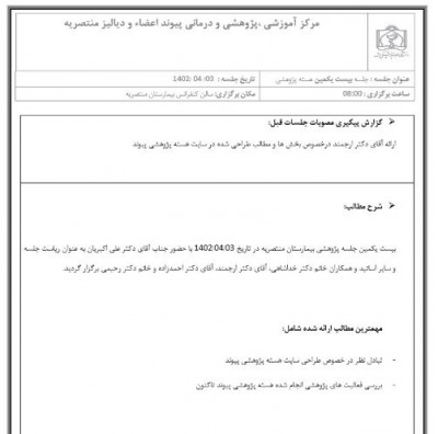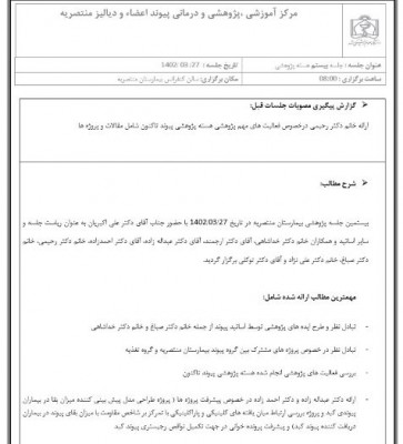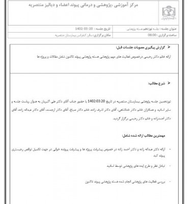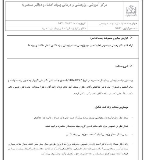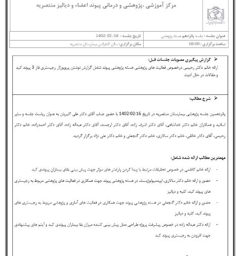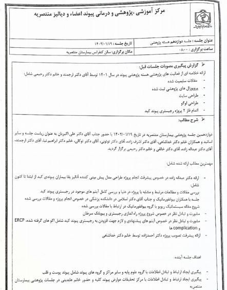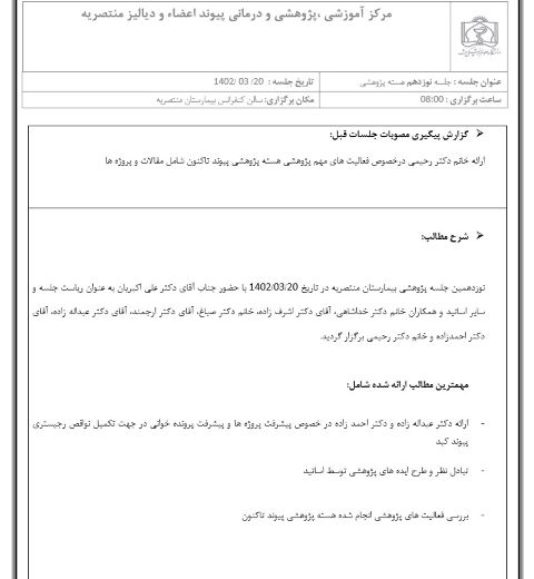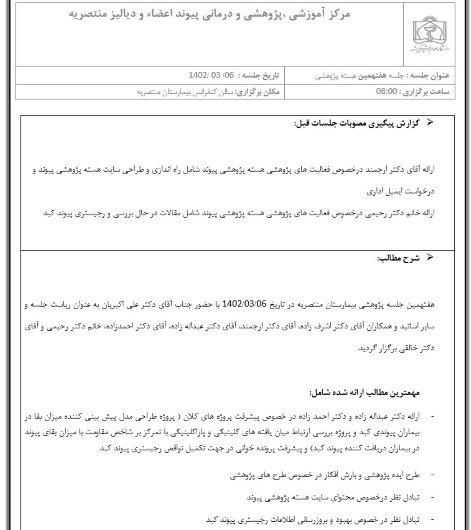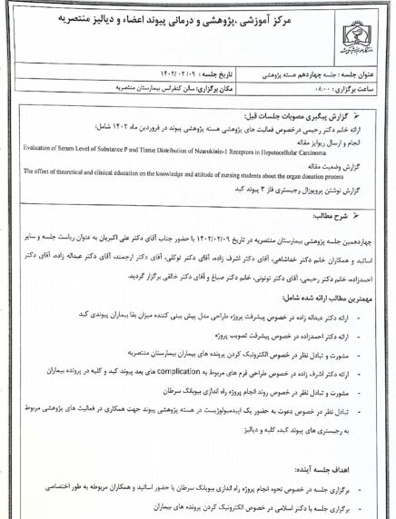 از شروع بکار هسته پژوهشی پیوند در بیمارستان فوق تخصصی پیوند اعضاء منتصریه تا کنون تعداد بیست و یک جلسه پژوهشی برگزار شده است که در این جلسات با حضور هیئت رییسه و اساتید در تخصص های مختلف در خصوص مباحث علمی مرتبط با حوزه پیوند و همچنین تعریف طرح های پژوهشی و ... تبادل نظر شده است.