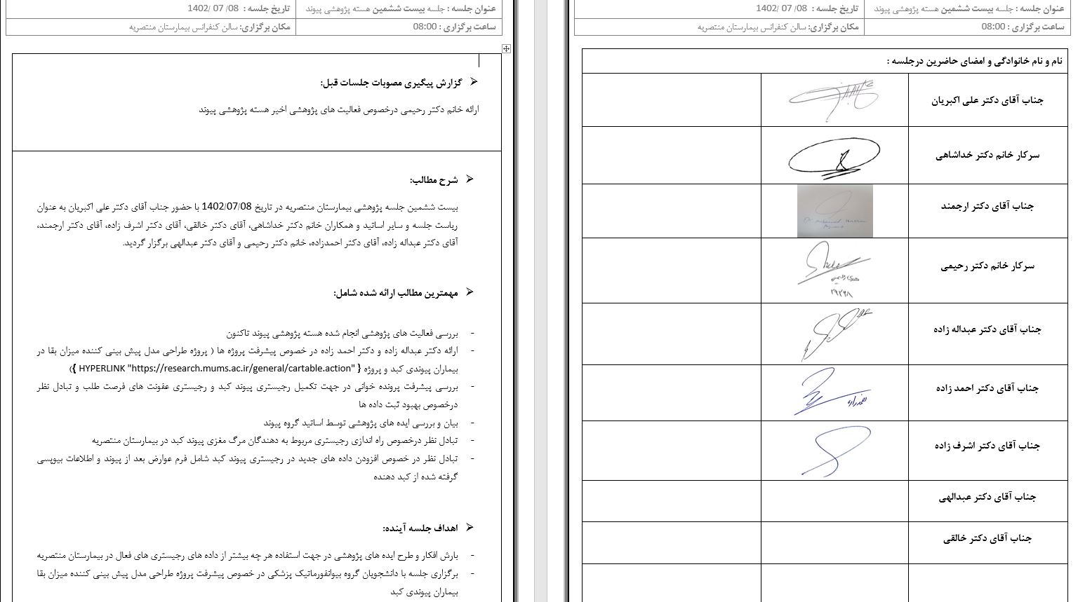 بیست و ششمین جلسه پژوهشی پیوند شنبه مورخ 8 مهر ماه 1402 در سالن کنفرانس بیمارستان منتصریه با حضور اساتید و اعضاء مرکز تحقیقات پیوند برگزار شد و در خصوص روند پیشرفت کار و ثبت داده های رجیستری بحث و تبادل اطلاعات گردید.