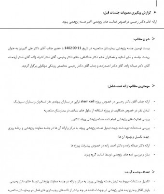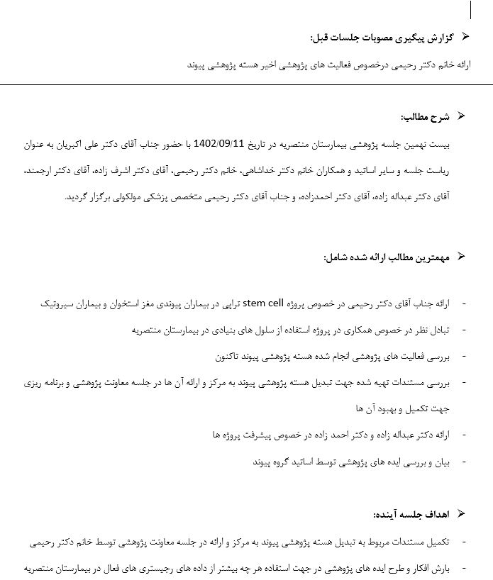 بیست و نهمین جلسه پزوهشی پیوند در روز شنبه مورخ 11 آبان ماه 1402 در سالن همایش بیمارستان منتصریه با حضور اساتید و اعضاء مرکز برگزار گردید. مهمان جلسه جناب آقای دکتر رحیمی متخصص پزشکی مولکولی در خصوص انجام stem cell تراپی در بیماران پیوندی و بیماران با مشکلات کبدی صحبت و رای زنی کردند.