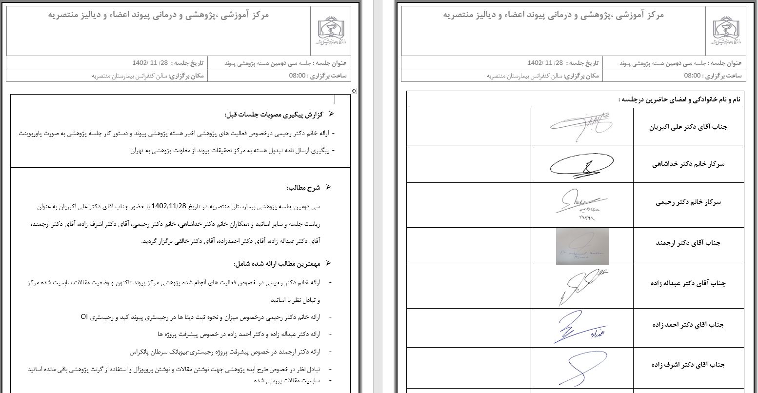 در تاریخ 28 بهمن ماه 1402 سی و دومین جلسه پژوهشی پیوند در سالن کنفرانس بیمارستان منتصریه برگزار گردید و در خصوص طرح موضوعات جدید پژوهشی و روند طرح های رجیستری کبد در قالب سرباز نخبه ارائه گزارش، رای زنی و گفتگو شد.