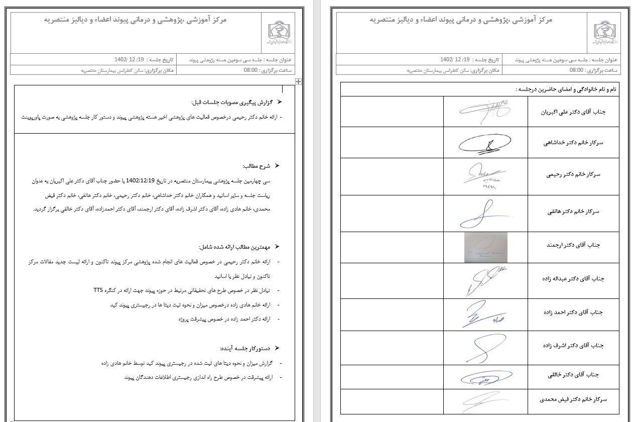 اخرین جلسه پژوهشی سال 1402 در تاریخ 19 اسفندماه در سالن کنفرانس بیمارستان پیوند اعضاء منتصریه با حضور اساتید و اعضاء مرکز برگزار گردید. در این جلسه در خصوص روند کار امور پژوهشی و رجیستری ها در سال جاری و همچنین اهداف پژوهشی سال آینده بحث و گفتگو شد.
