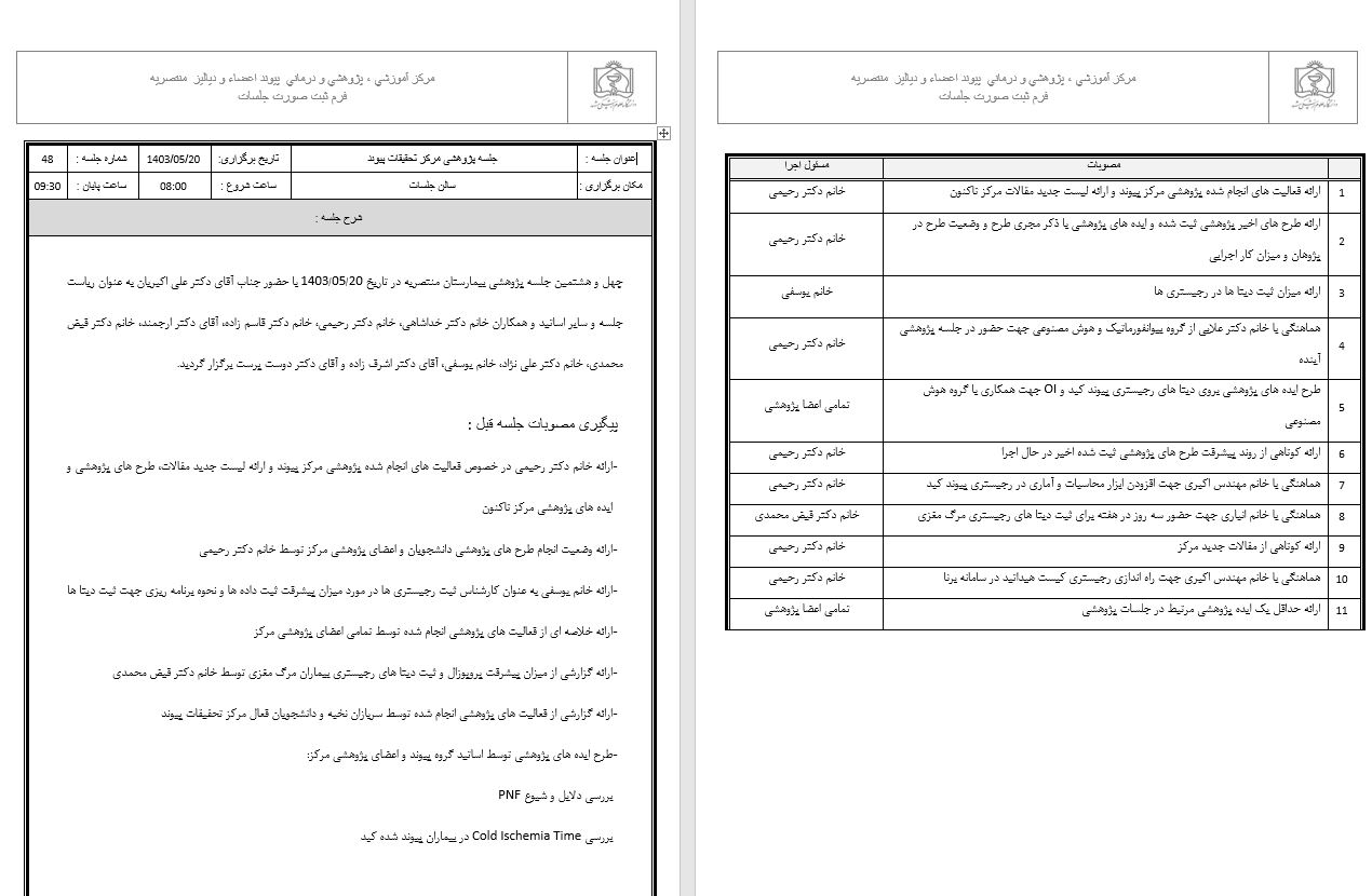 در تاریخ 20 مرداد ماه 1403 چهل و هشتمین جلسه پژوهشی مرکز تحقیقات پیوند با حضور اساتید و اعضاء برگزار و در خصوص طرح های پژوهشی و روند پیشرفت امور مربوطه گفتگو و تبادل اطلاعات گردید