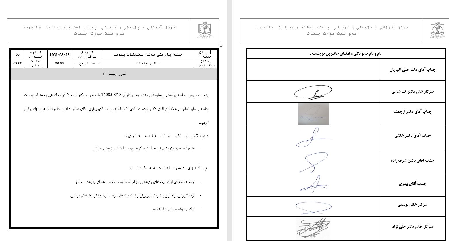 پنجاه و سومین جلسه پژوهشی مرکز تحقیقات پیوند در روز شنبه مورخ 12 آبان ماه 1403 با حضور اساتید و اعضائ مرکز برگزار و در مورد پیشرفت امور پژوهشی و رجیستری های مرتبط گفتگو شد.