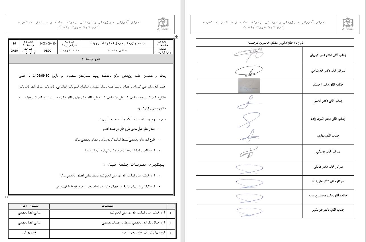 پنجاه و ششمین جلسه پژوهشی مرکز تحقیقات پیوند در تاریخ 10 آذرماه 1403 در سالن کنفرانس بیمارستان منتصریه برگزار گردید. در این جلسه با حضور اساتید و اعضاء مرکز در خصوص در مورد پیشرفت طرح ها و ثبت رجیستری های فعال گفتگو و تبادل نظر گردید.