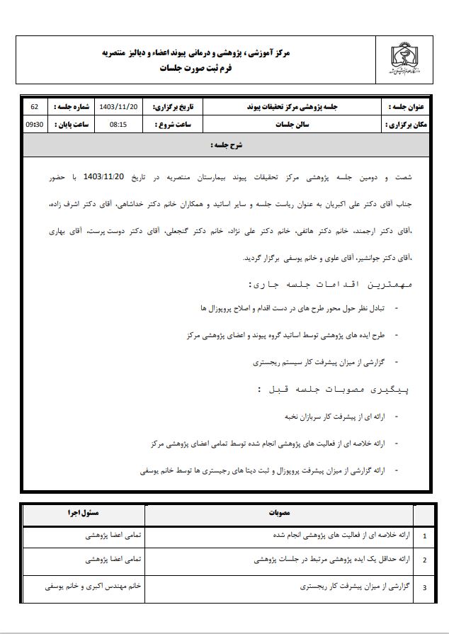 در تاریخ 20 بهمن ماه 1403 شصت و دومین جلسه پژوهشی مرکز تحقیقات پیوند با حضور اساتید و اعضاء مرکز برگزار و در مورد روند انجام طرح های پژوهشی و بررسی ایده های پژوهشی رای زنی و تبادل اطلاعات شد.
