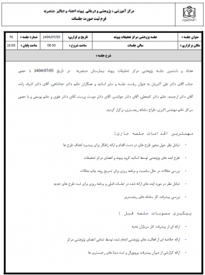 در تاریخ 5 مهر ماه 1404 هفتاد و ششمین جلسه پژوهشی مرکز تحقیقات پیوند با حضور اساتید و اعضاء در سالن کنفرانس بیمارستان منتصریه برگزار گردید و در مورد طرح های تحقیقاتی و روند پیشرفت امور پژوهشی رای زنی و تبادل اطلاعات گردید.
